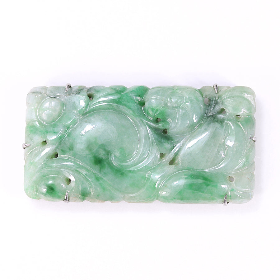 This exquisite vintage obidome features natural Burmese jadeite in a coveted apple green hue, intricately carved with traditional floral motifs and flowing scrollwork. The jadeite exhibits excellent translucency with beautiful color variations from pale celadon to vibrant apple green. Set in sterling silver with an openwork gallery, this piece was originally designed to secure an obi (kimono sash) and can be worn traditionally or repurposed as a unique pendant or brooch.